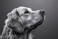 Op de zwart-wit close-up foto tegen een licht donkere achtergrond straalt een Golden Retriever vriendelijkheid uit. Zijn zachte, golvende vacht is vol details zichtbaar. De ogen, groot en liefdevol, kijken met een kalme intelligentie. Zijn neus is vochtig en glanzend, terwijl de oren ontspannen hangen, accentuerend zijn zachtaardige en trouwe aard.