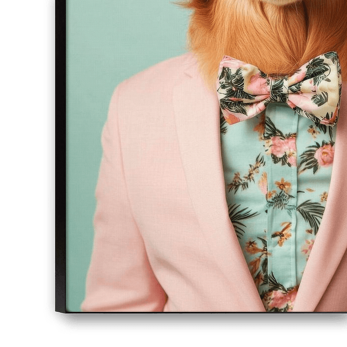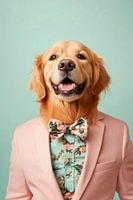 Een charmante golden retriever schittert in een elegant, lichtroze pak en een kleurrijk strikje. Zijn brede glimlach en alerte ogen roepen meteen een goed humeur op. Met een vleugje verfijning en een speelse uitstraling is hij de onconventionele blikvanger op elk feest. Een dierlijk stijlicoon dat zelfs de meest serieuze gelegenheden zal opfleuren!