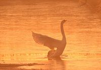 Een krachtig moment waarin een zwaan zijn vleugel spreidt in het warme gouden ochtendlicht. De reflecties op het water en de mistige sfeer creëren een bijna magisch beeld van beweging en rust tegelijk. Een statement piece dat natuur en kracht combineert.