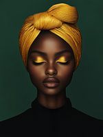 Een Afro-Amerikaanse vrouw straalt tijdloze elegantie en kracht uit. Haar huid heeft een diepe, warme glans die prachtig contrasteert met de gouden hoofddoek die haar hoofd omhult. De hoofddoek glinstert subtiel in het licht en valt sierlijk over haar schouders, als een kroon die haar uitstraling versterkt.