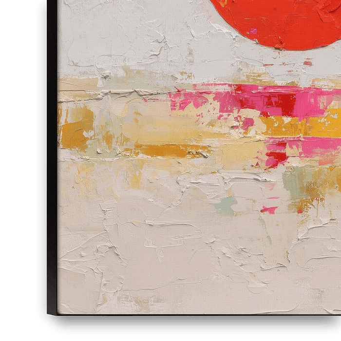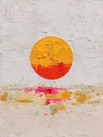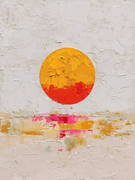 'Golden Solstice' viert de kracht van de zomerzon in een gedurfde, minimalistische compositie. De centrale, okergele zon vormt een rustpunt tegen een achtergrond van rijke, witte impasto-texturen die doen denken aan witgekalkte mediterrane muren. De subtiele reflecties van roze en goud in de onderste laag geven het werk diepte en een…