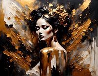 Goud, het symbool van weelde en tijdloze schoonheid, doordrenkt deze portretten met een stralend aura. Stel je een vrouw voor die baadt in de warme gloed van goud, haar huid glinsterend als kostbaar metaal, haar ogen fonkelend met een innerlijk licht dat de zon evenaart.