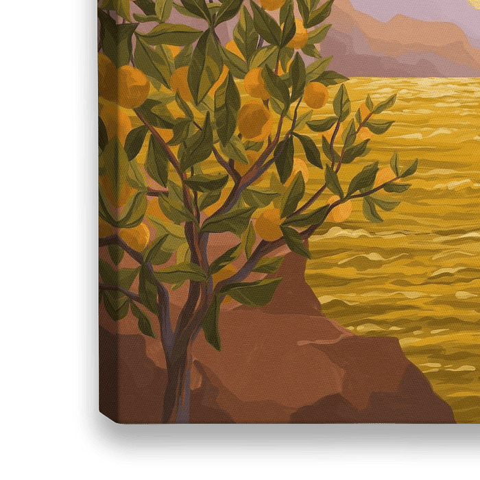 Wij houden van kleurrijke illustraties waar je vrolijk van wordt en waar je graag bij wegdroomt. Mediterraanse sferen zijn dan graag onze inspiratiebron met een mooie botanische achtergrond. In dit landschap gaat de zon bijna onder en zie je het moment dat de hele wereld even goud kleurt.