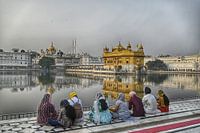 De adoratie in geloof die de mensen rust geeft in de drukke omgeving van de Golden Temple van Amritsar, Indië