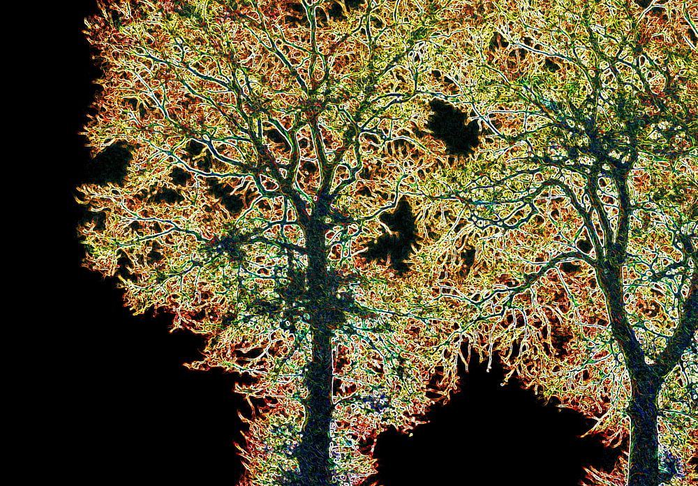 Twee in elkaar groeiende bomen met een fijne structuur. De basis voor dit kunstwerk is fotografie. Een heel apart en unieke creatie die U warmte biedt. Een absolute eye-catcher die mooi past bij hout, staal en koper...