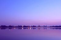 Reflectie van de Rotterdamse skyline over een serene Kralingse Plas tijdens zonsondergang