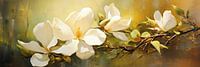 Golden Whisper - Dit bloemen schilderij viert de schoonheid van de magnolia, afgebeeld met weelderige witte en crèmekleurige bloesems op donkergroene bladeren tegen een gouden achtergrond.