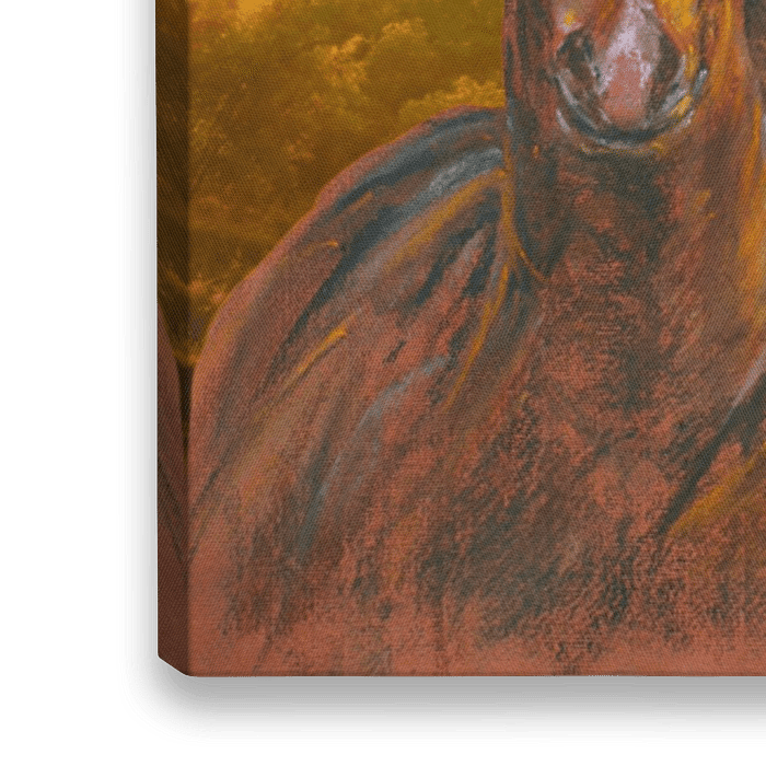 De schoonheid van een paard met de zon op zijn gouden manen. Kracht en vrijheid. Pastelkrijt op gekleurd papier.