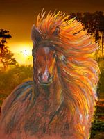 De schoonheid van een paard met de zon op zijn gouden manen. Kracht en vrijheid. Pastelkrijt op gekleurd papier.