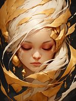 Een meisje gevangen in een droom wordt omringd door een wervelwind van goud.