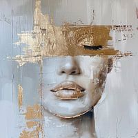 Een abstract portret van een vrouw met opvallende penseelstreken en accenten van goudfolie.