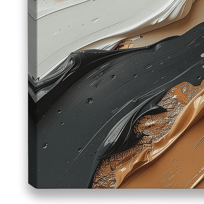 De compositie ademt een subtiele luxe: lagen van ivoor, beige en zand vloeien samen met diepe accenten van zwart en koper. De gouden stroken voegen een vleug glans en gelaagdheid…