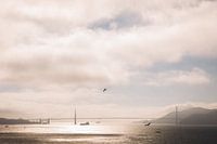 Voorbij vliegende foto's op het water varend richting Alcatraz vlakbij de Golden gate bridge in San Francisco tijdens zonsondergang.