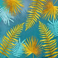 Gouden varens en palmbladeren op een groenblauwe (turquoise) vierkante achtergrond met albizia bladeren. Breng de natuur in huis met natuurlijke vormen in een bijzondere gouden uitvoering.