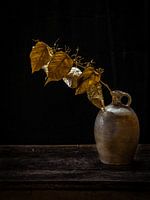 Een stilleven van een oude aardwerk kruik met een tak gouden herfstblad van Japanse duizendknoop op een houten tafel