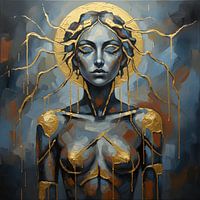 Onderwerp en Houding: Het toont een vrouwelijk figuur, recht van voren afgebeeld. In tegenstelling tot de serene blik van het vorige stuk, kijkt deze figuur intens en direct naar de…
