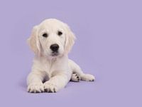 Golden retriever puppy in het paars / Cute golden retriever puppy lying on the floor facing the came van Elles Rijsdijk