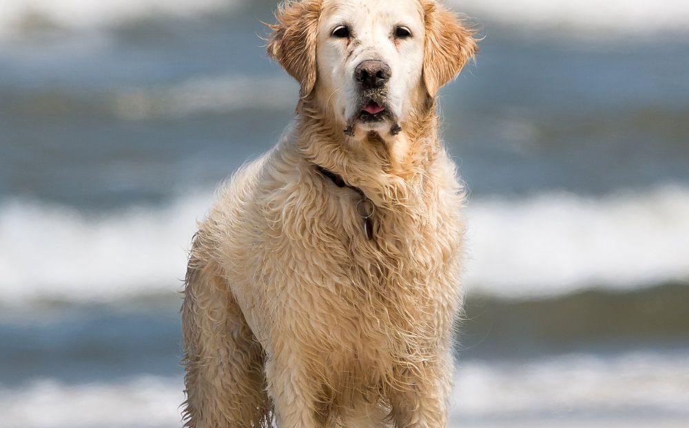 Golden retriever op het strand van Ballum, Ameland, Holland. Net gezwommen en uitwaaien in de frisse bries, juni 2016.