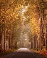 De herfstzon in de vroege ochtend verlicht de bomen en creëert een mooi gouden effect.