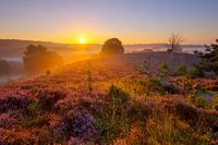 Wat een schitterende morgen op de Posbank (Gelderland, Nederland). De mist hing heerlijk tussen de heuvels, de heide was knalpaars en de zon ging mooi goudgeel op. Zelfs de dode boomstronk kwam in het licht te staan en leek toch even te leven! Puur genieten van dit natuurschoon.