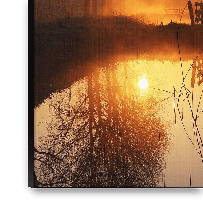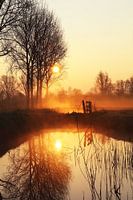 Zonsopkomst in de polder met reflecties in het water.