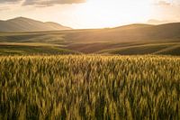 De lucht boven de Iraanse heuvels kleurt geel door de ondergaande zon. De graanvelden worden in een gouden gloed gezet. Het landschap is gelaagd: licht, donker en weer licht