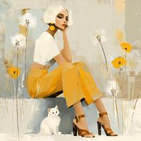 Figuratief werk van een dromerige vrouw omringd door gele en witte bloemen.