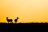 Twee edelherten met daarachter de ondergaande zon.