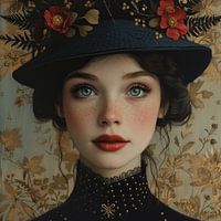 Details: portret, vrouw, modern, goud, zwart, bloem, elegantie, schoonheid, kunst, hoed