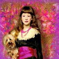 Ik ben echter zo vrij geweest om de jongedame voor een nieuwe achtergrond te plaatsen, die uit verschillende opeenvolgende lagen is opgebouwd. Door de gouden afwerking bedacht ik spontaan de naam voor het schilderij. Dit schilderij…