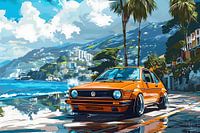 Een feloranje Volkswagen Golf I glanst in de zon, een tijdloos icoon van autogeschiedenis. De compacte, hoekige carrosserie straalt een charmante retro-stijl uit. De ronde koplampen geven het voertuig een speelse blik, terwijl de chroomdetails een vleugje elegantie toevoegen. Het interieur, eenvoudig maar functioneel, weerspiegelt de…
