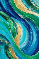 Een harmonieuze melodie van de natuur ontvouwt zich met vloeiende kleurenstromen in levendig blauw en zacht groen. Gouden accenten glinsteren als zonnestralen op het wateroppervlak. Deze dynamische compositie brengt een frisse wind in elke woonkamer en creëert een uitnodigende sfeer die uitnodigt om te ontspannen en te dromen.