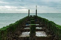 Golfbreker op het strand van Domburg,zeeland, Nederland. De lijnen van de golfbreker zorgen voor diepte in het beeld en leiden het oog naar de zee en de horizon. Het mos, groeiend op de palen van de golfbreker, geeft de foto een mooie frisse groene kleur mee.