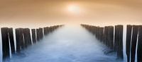 Dit zijn twee foto's van dezelfde rij palen samengevoegd tot één. De linkerkant is de normale weergave en rechts is omgedraaid. De lucht met de zon zijn toegevoegd en aangepast met zoom en bewegingsfilters. Tenslotte zijn er twee kleurverloopfilters toegevoegd.