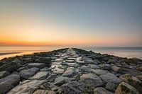 Een golfbreker aan de Noordzeekust komt bloot te liggen bij laag water . De zon schijnt nog een laatste maal zijn licht en brengt het geheel tot leven .