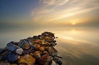 Golfbreker aan het Ijsselmeer op een mistige ochtend bij zonsopkomst