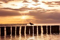 Een meeuw zit op een houten golfbreker bij zonsondergang in de Oostzee op het eiland Poel in Duitsland.