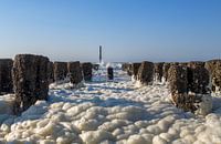 Een onstuimige dag op het strand van Domburg, Zeeland, Nederland. Door de woest zee spoelde er veel zeeschuim aan op het strand waardoor de golfbreker vol liep met dit schuim en voor een mooi beeld zorgde.Prachtige stormachtige dag, het was lekker uitwaaien en genieten aan de Zeeuwse kust.