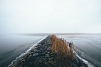 Golfbreker aan de kust van Stavoren in de Gemeente Súdwest-Fryslân. IJskoude mistige winteromstandig heden op een bevroren IJsselmeer! Golfbreker in de mist!