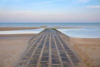 Een golfbreker tijdens eb op het strand van Koksijde (België) tijdens de ochtend.