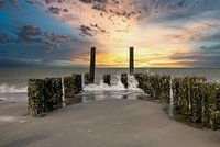 Deze golfbreker heb ik gefotografeerd in Westkapelle tijdens een bewolkte dag na zonsondergang, blue hour dus. Ik ben in de golfbreker gaan zitten wat mogelijk was omdat het eb was geworden en het water terug getrokken was. Ik ben laag bij de grond gaan zitten en heb als compositie ervoor gekozen de kopkant van de golfbreker beeldvullend te fotograferen met een doorkijkje tussen de koppalen door, de hoogste palen van de golfbreker. Ook hier heb ik geprobeerd de watergolven zo te timen dat ze zichtbaar waren aan het begin van de golfbreker waarbij het water verder uitliep in de golfbreker. De met zachte kleuren verzadigde lucht en de wolken maakte voor mij het beeld compleet. Een mooie herinnering aan het mooie Zeeuwse Westkapelle, een krachtig beeld voor aan de muur !