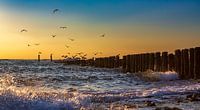 Het was een mooie stormachtige dag aan de kust van Westkapelle, Zeeland, Nederland. Deze foto heb ik gemaakt bij Westkapelle tijdens zonsondergang. De zee was ruig en er waren hoge watergolven te zien, het door mij laag gekozen camerastandpunt versterkte het beeld. Een grote groep meeuwen streken neer op de golfbreker, samen met de golven op de voorgrond zorgde het voor een dynamisch beeld. Een mooie opname van een sfeervol momentje aan de kust van Westkapelle, een krachtig en rustgevend beeld voor aan de muur.