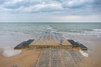 Een golfbreker bedekt met golven op het strand van Koksijde (België) tijdens de opkomende vloed