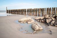 Een golfbreker langs de kust van de provincie Zeeland in Nederland. Op de voorgrond keien die rond de golfbreker liggen.