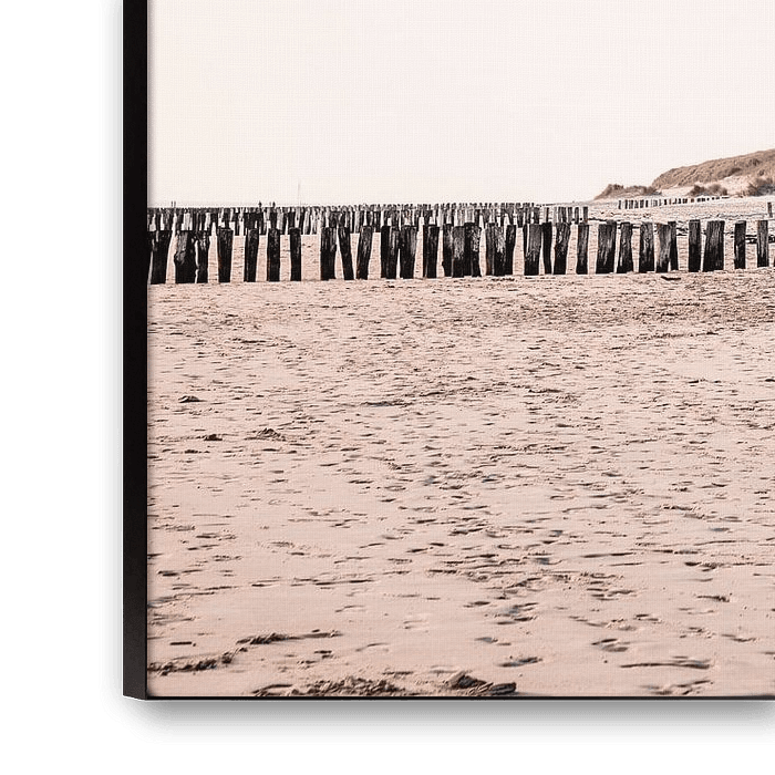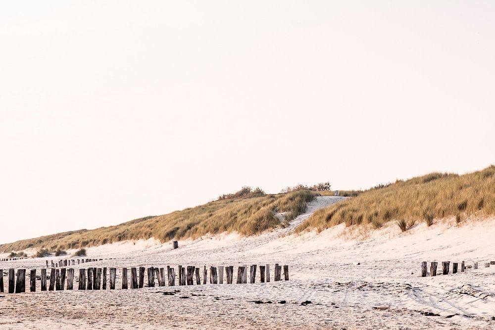 Deze rustgevende kustfoto uit Vlissingen toont een lange rij strandpalen die zich in een vloeiende bocht uitstrekken richting de duinen. De laagstaande zon werpt zacht licht over het natte zand, waardoor fijne patronen en voetsporen zichtbaar worden in de voorgrond. De warme tinten van het zand en de groentinten van het helmgras creëren een natuurlijke harmonie, terwijl de spiegeling van de palen in het stille water een gevoel van stilte en evenwicht oproept. Een beeld dat perfect de rust van een Nederlandse kustlijn bij laagtij weerspiegelt.