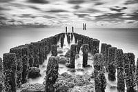 De wel bekende golfbrekers in de vorm van een serie paaltjes die ervoor zorgen dat de golven en de stromingen gebroken worden. De paaltjes zijn ver aangetast door het zeeleven en het zoute water