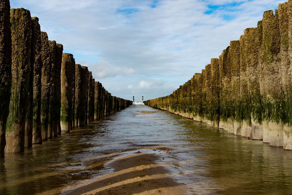 Golfbrekers aan het strand van Domburg, een mooie Hollandse lucht boven de golfbrekers.