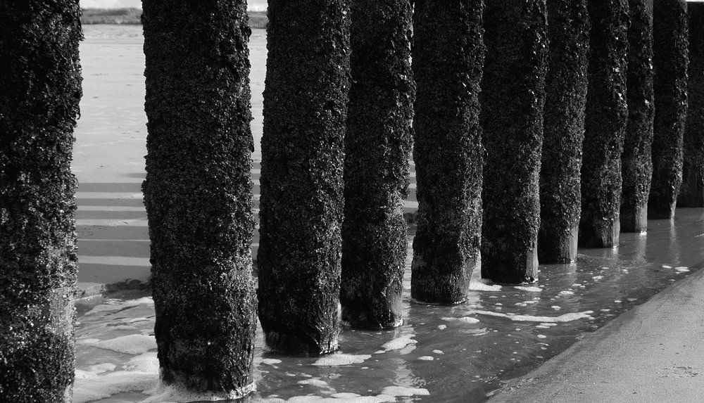 Golfbrekers aan het strand van Breskens in Zeeuws Vlaanderen in zwart en wit. Foto gemaakt op een zonnig bewolkte dag in het najaar.