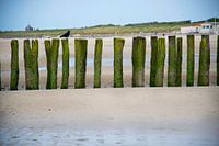 Houten golfbrekers aan de Zeeuwse kust bij Zoutelande.