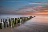 Golfbrekers en zonsondergang in Westkapelle, met prachtige kleuren en reflectie in het water